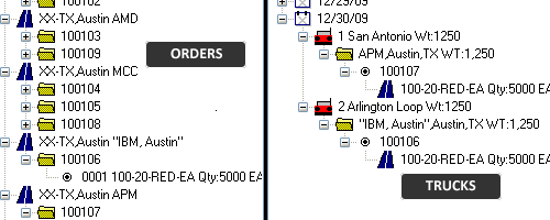Order lines are dragged to awaiting trucks to create shippable loads. Weight and